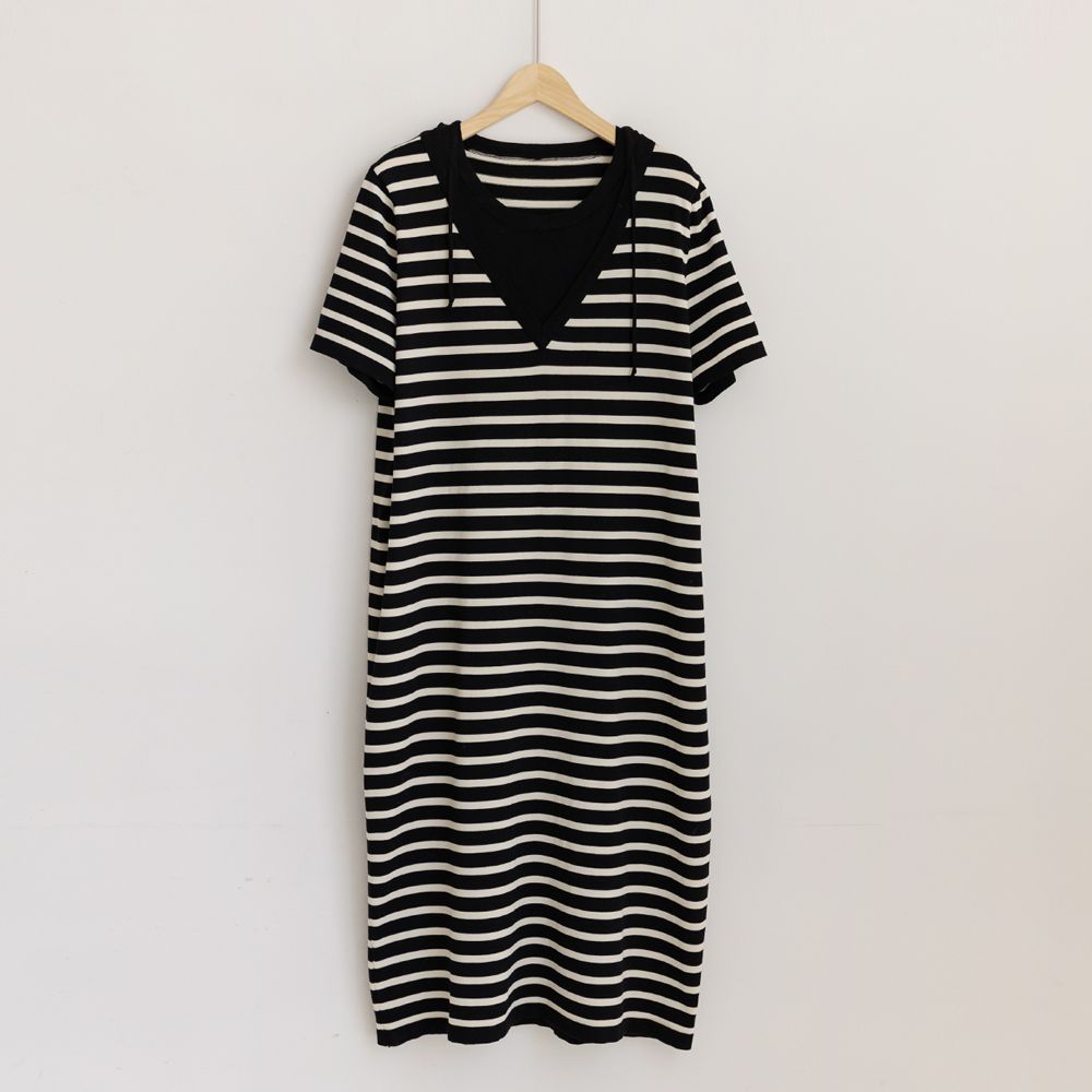 [66-100] 런피 배색 후드 니트 반팔 원피스