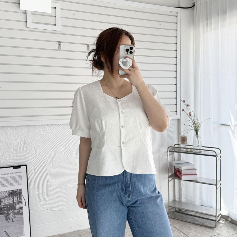 [77-110사이즈]진주 은장 블라우스 빅사이즈 여름 하객룩 유니크 스퀘어넥 뱃살커버