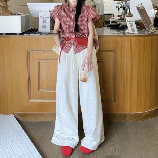 르안 프릴카라 체크 반팔블라우스+레이스 와이드팬츠