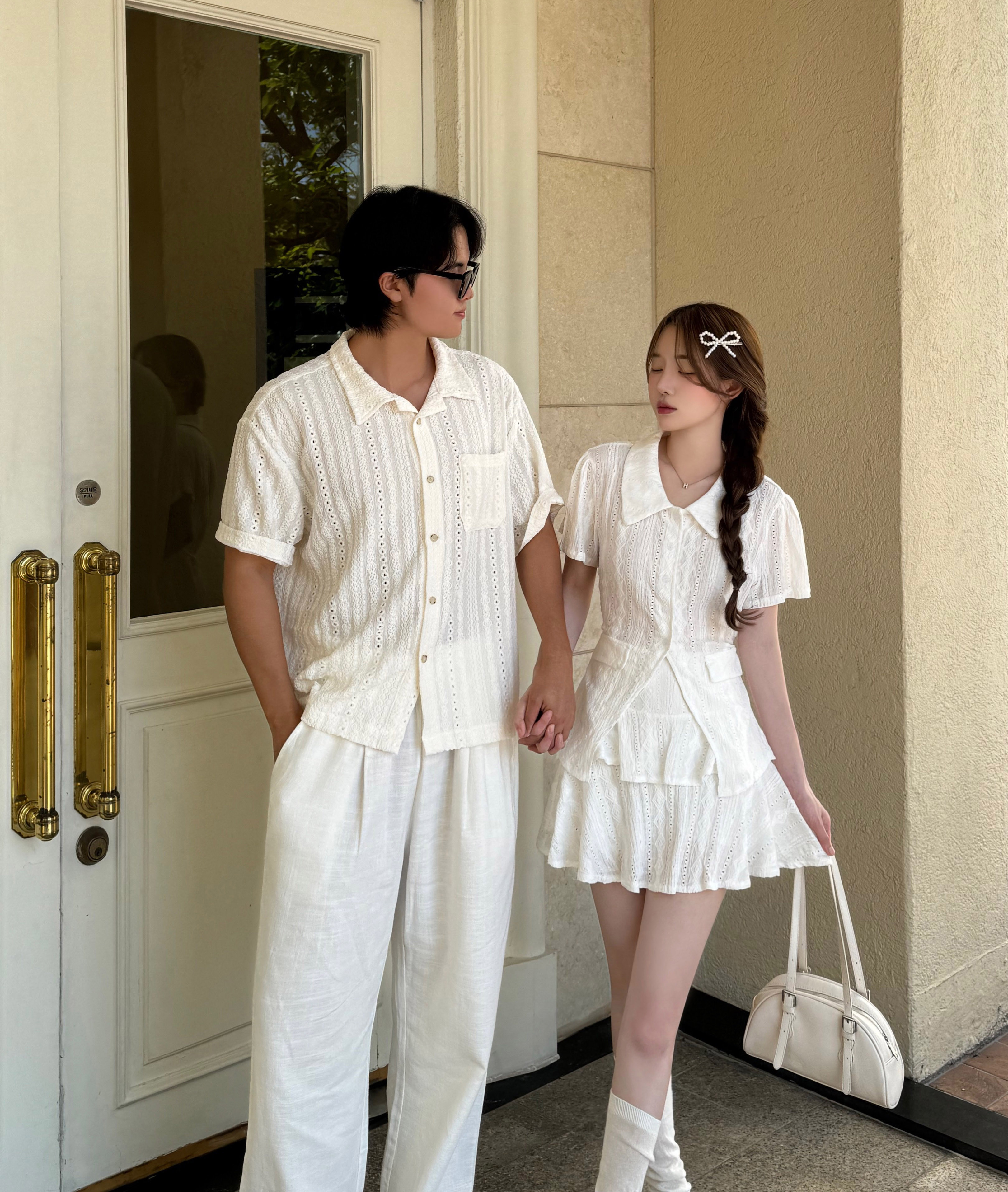 단독🤍[린넨소재/핏보장] 린넨 반팔 투피스 셔츠 커플룩 시밀러룩 강추 오버핏 쿨 남자셔츠 크롭 카라 퍼프 레이스 캉캉 스커트 밴딩 와이드팬츠 에스닉 데이트 휴가 남녀공용