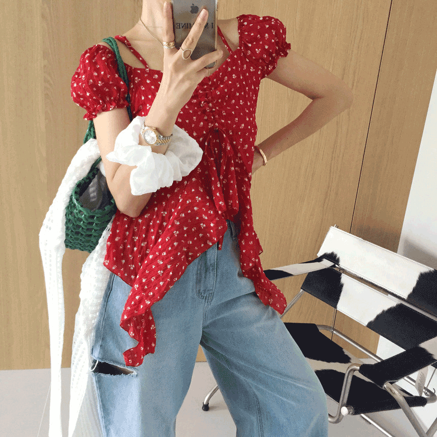 틴트 플라워 패턴 오프숄더 끈 셔링 프릴 스모크밴딩 사선 언발 크롭 여름블라우스 (2color)