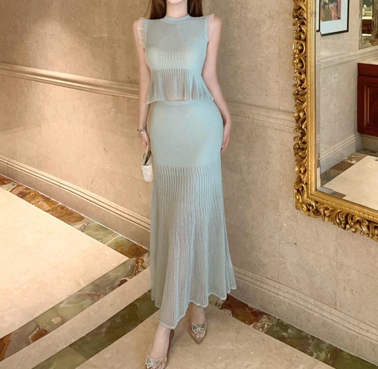 민트 블루 니트 슬리브리스 셔츠 하이웨이스트 피쉬테일 스커트 투피스 세트