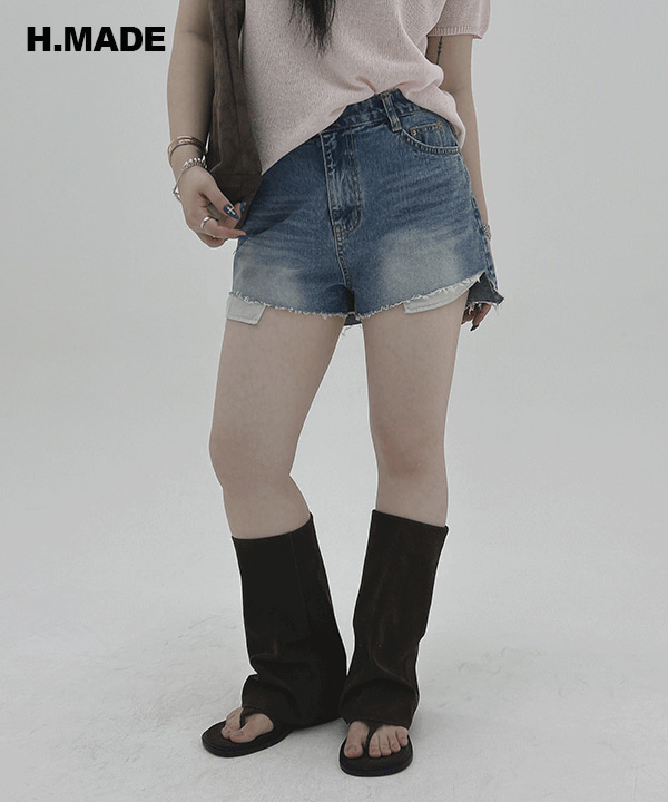 MADE #13482 [2기장/키큰녀] 유니크 언발 컷팅 포켓 워싱 데님 반바지 : 1color / XS~2XL