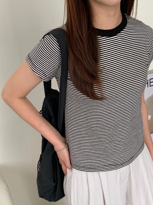 [4color] 스트라이프 단가라 라운드 크롭 반팔 티셔츠