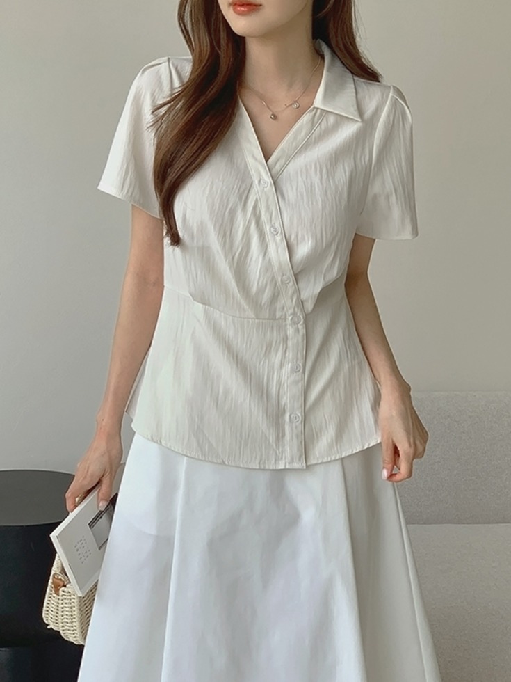 [1천장 돌파✨][무료배송][체형보완/오피스룩추천] [44-120] 르뷰디네 오픈카라 랩스타일 반팔 블라우스( 신상-여름-썸머-하객룩-출근룩-데일리룩-빅사이즈-120사이즈-자체제작-카라블라우스-반팔블라우스 )