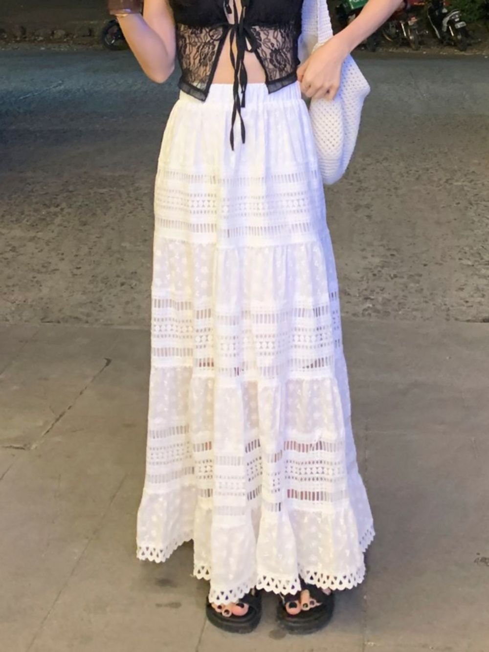 [맥시/휴양지]리플 자수 플레어 코튼 롱 스커트 (1 color)