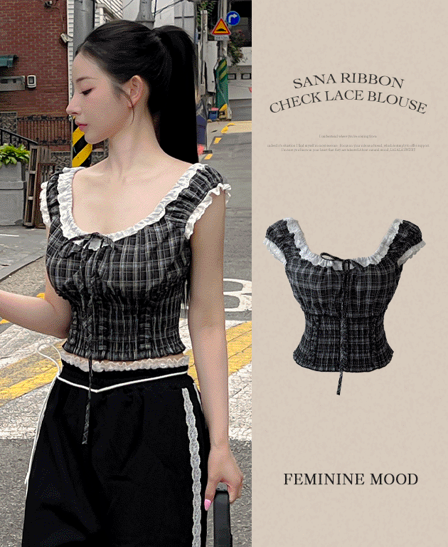 [허리잘록💫/오프숄더] 사나 리본 체크 스모크 레이스 프릴 넥 라운드 민소매 슬리브리스 나시 리본 끈 블라우스