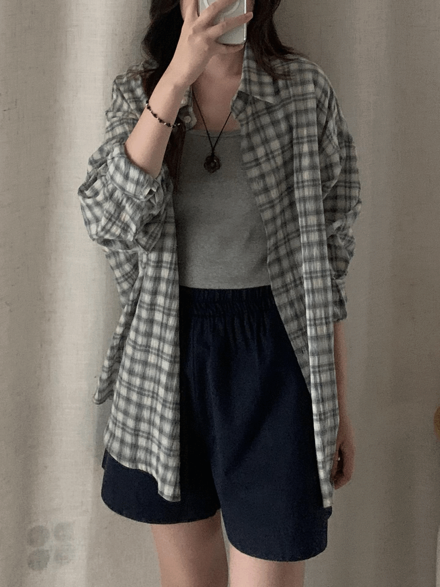 피크 카라 오버핏 체크 셔츠 (여름셔츠/살안타셔츠/긴팔셔츠/꾸안꾸/장마룩)