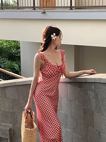 [🌴휴양지원피스/스퀘어넥/바캉스룩] 하퍼 체크 프릴 스퀘어 롱 원피스