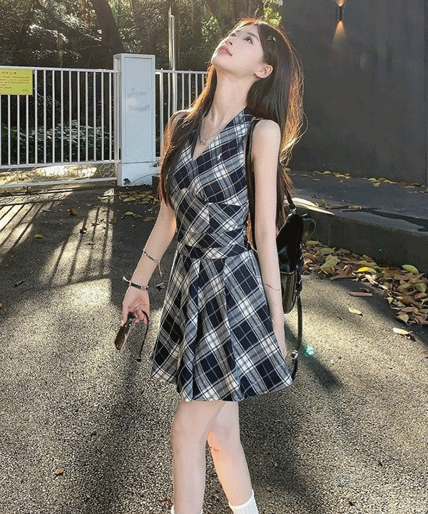 힙스타일 빈티지 체크 홀터넥 백리본 허리 날씬하게 조이는 민소매 플리츠 스커트 주름 원피스
