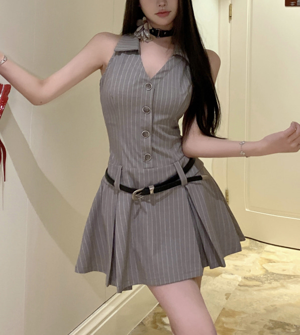 여름 프레피룩 민소매 나시 플리츠 미니 원피스+벨트포함