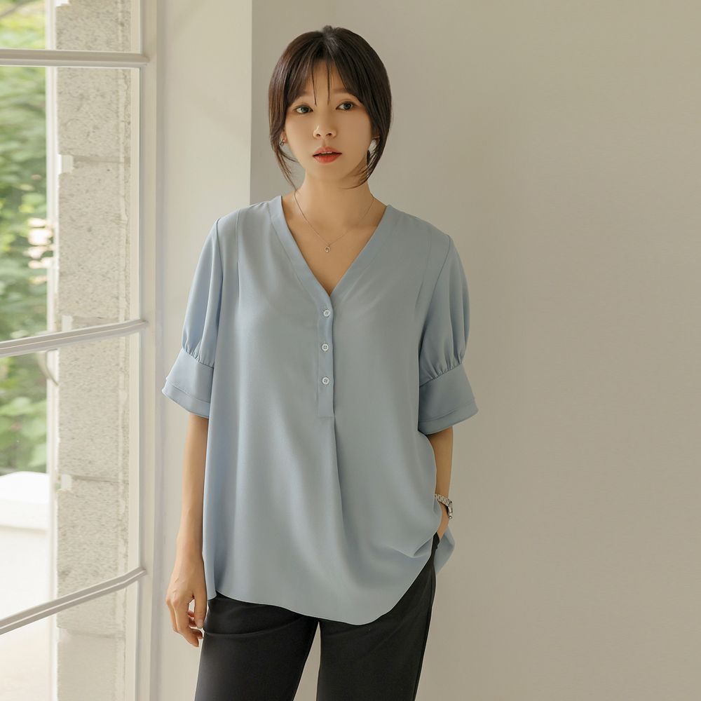 [66-110] 소룬 브이 셔링 프릴 반팔 블라우스