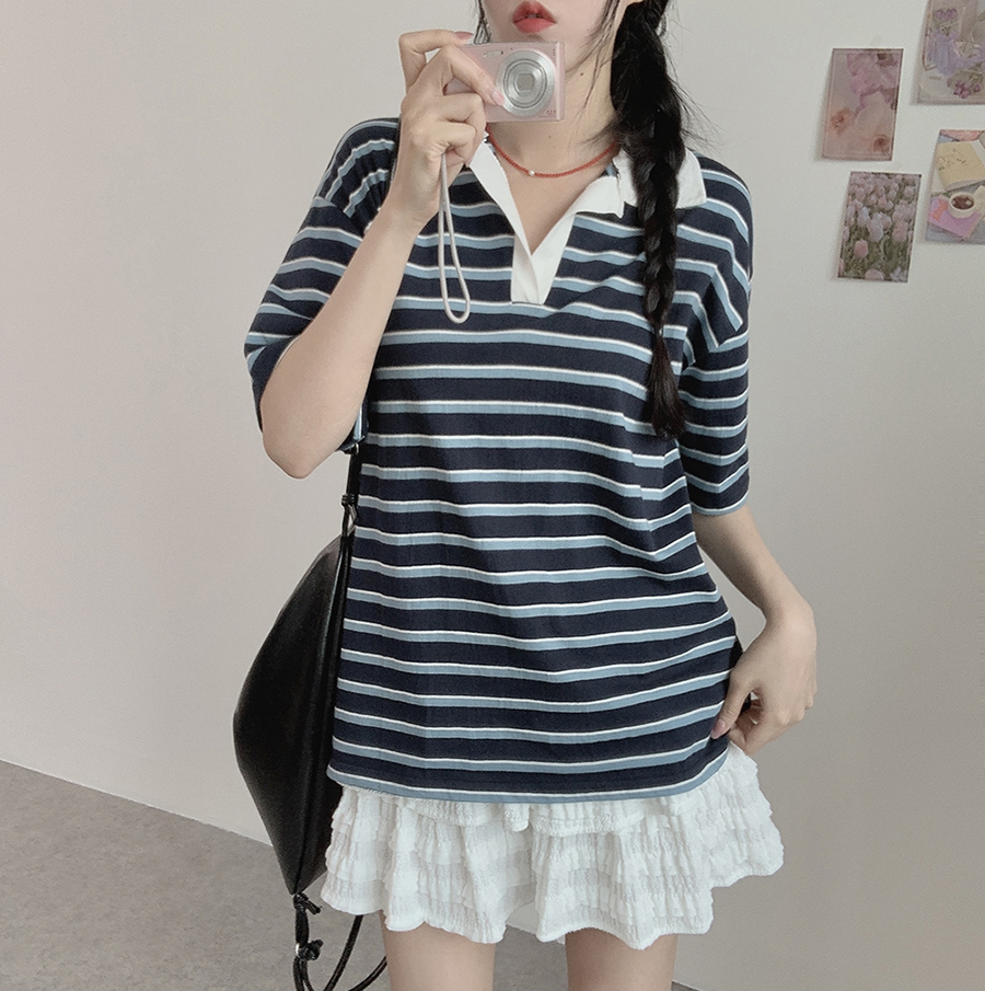 [실물보장💕/루즈핏] 로로 카라 스트라이프 단가라 루즈핏 반팔 티셔츠 3color