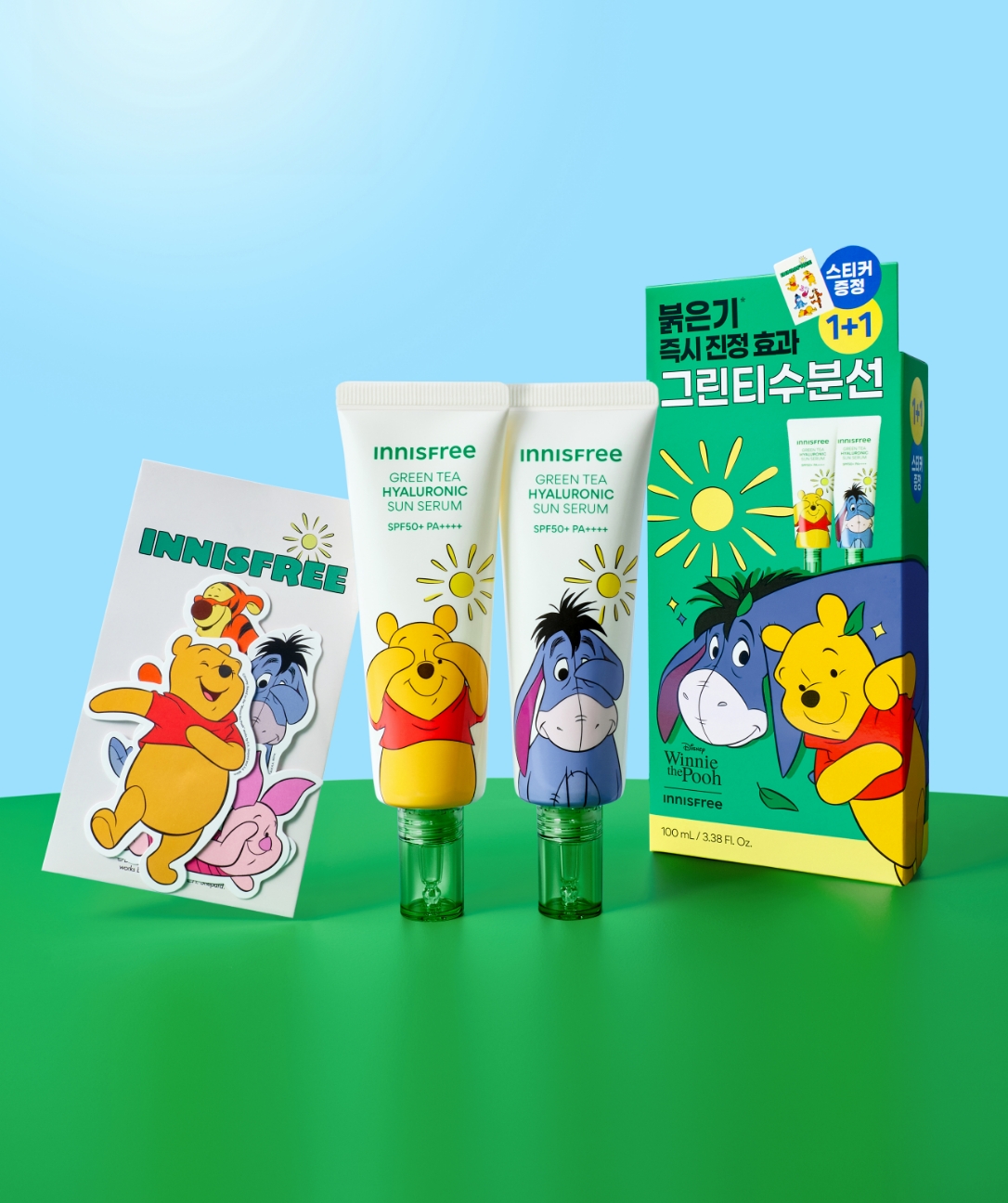 용량(중량)[본품] 이니스프리 그린티 히알루론산 진정수분 선세럼 SPF50+ PA++++ (50mL+50mL) + [증정품] 이니스프리 l 디즈니 위니더푸 (푸와 친구들 스티커팩)