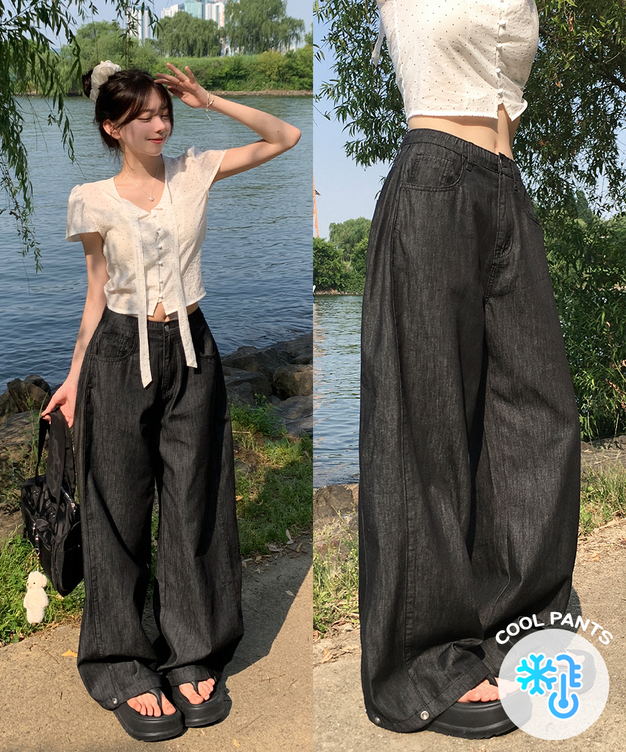 [💙쿨링생지💙/골반볼륨!!/하체커버✨] 네오트 사이드 핀턱 밑단 스냅버튼 허리밴딩 와이드 조거 데님 생지 청바지 코튼팬츠 키작녀 키큰녀 기장선택 하체커버 하비추천 시원한바지