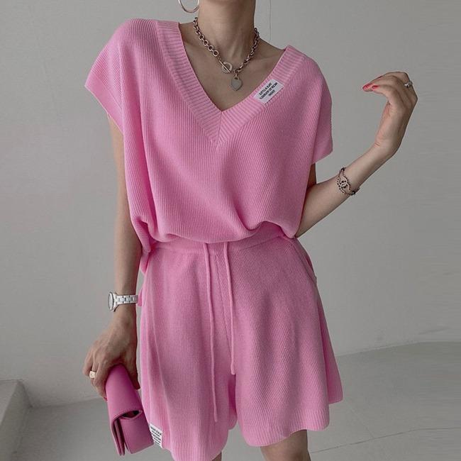 벨로-니트set 브이넥니트+밴딩반바지 비치룩 휴가룩 트레이닝셋트 여름니트