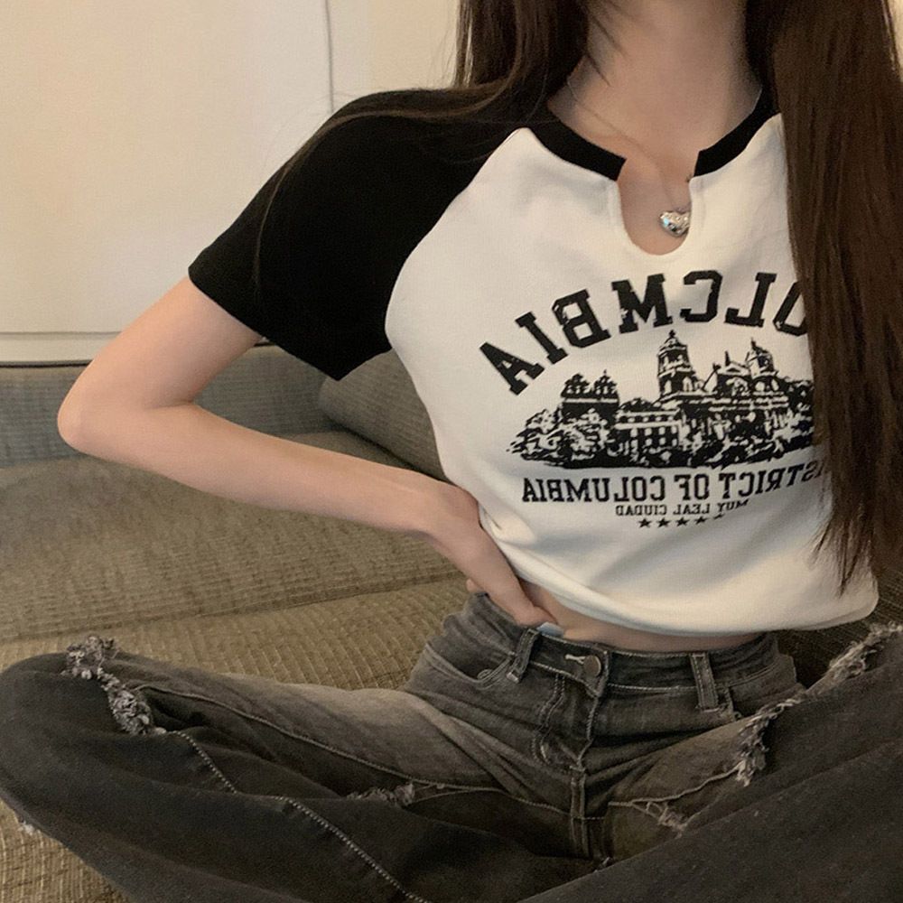여성 여름 배색 크롭티 반팔 배꼽티 Y2K 스타일