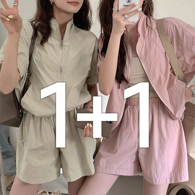 1+1 2셋트 바캉스룩 밀리-크롭셋트 반팔 바람막이 윈드 아노락 밴딩 반바지
