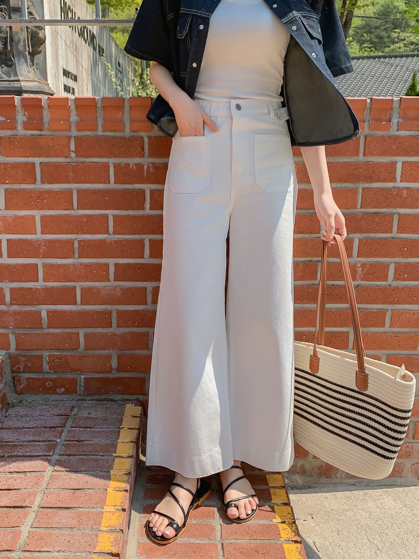 [썸머] 하이웨스트 아이보리 와이드 팬츠 통바지 앞포켓 데일리룩 바캉스룩