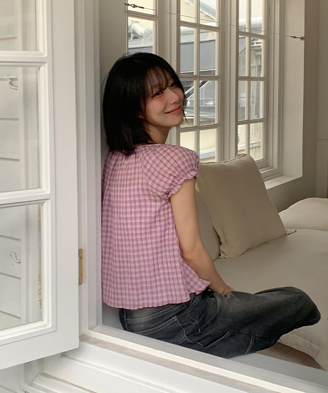 허엘코 체크 크롭핏 코튼 라운드넥 블라우스