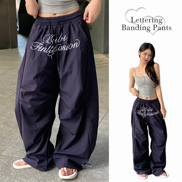 [여름신상/오버핏] 보타 Y2K 프론트 영문 레터링 자수 핀턱 나일론 스트링 바스락 와이드 루즈핏 밴딩 롱 팬츠 투웨이 트레이닝 바지 (조거 팬츠 가능)