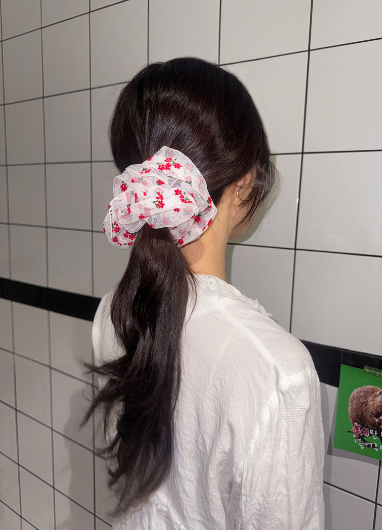 HeHe Flower scrunchie 헤헤 레드 플라워 화이트 시스루 오간자 꽃 빅스크런치