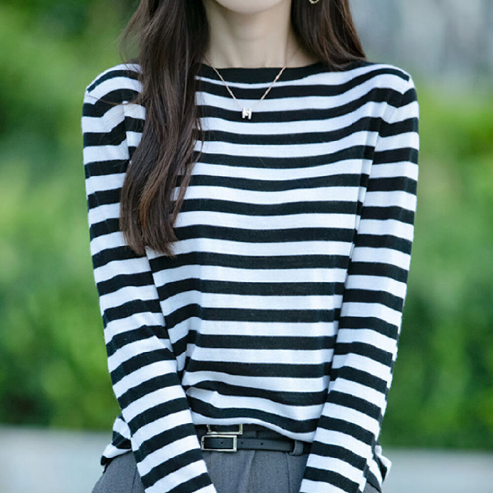 [나바바] NK3139 여성 캐주얼 단가라 라운드넥 긴팔 니트티
