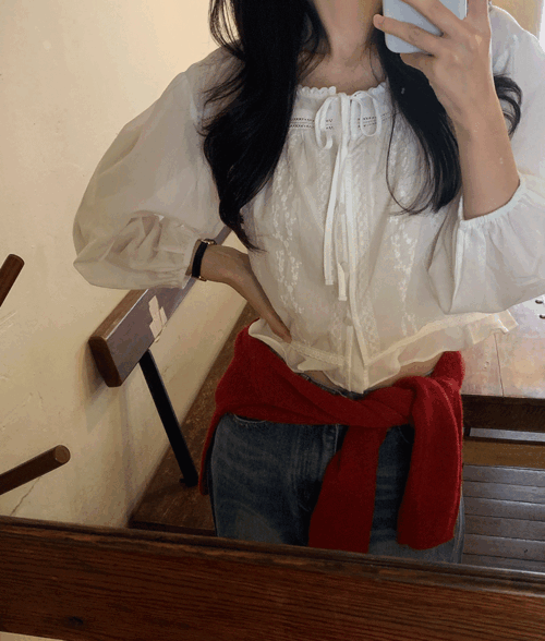 코이레이스블라우스 1color 데일리룩/러블리/레이스블라우스/자수블라우스/크롭블라우스/물결블라우스/퍼프블라우스/에스닉블라우스