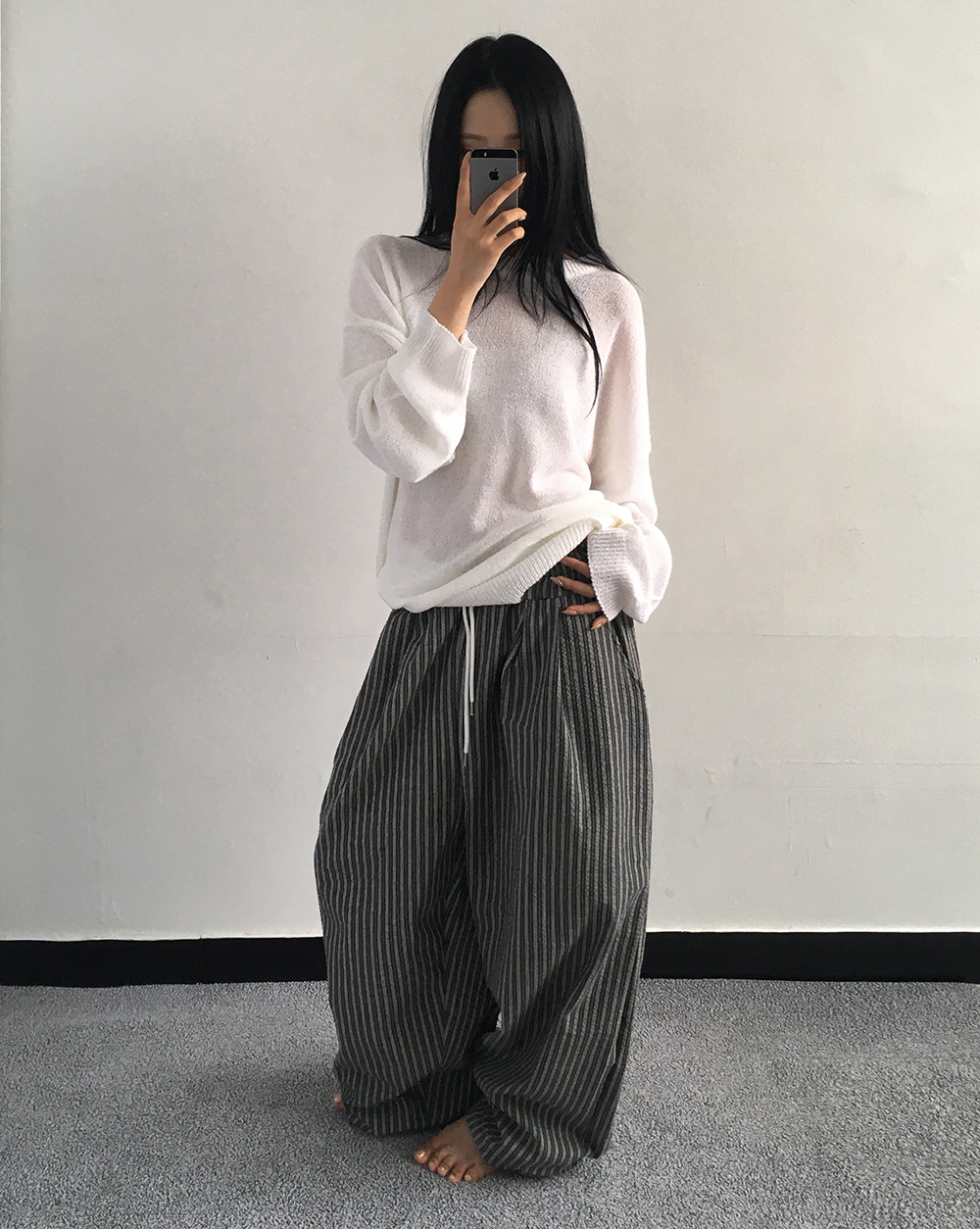 (Unisex) 티브 시어서커 스트라이프 투턱 와이드 팬츠 (2color) 벌룬핏 스트링 밴딩 롱팬츠