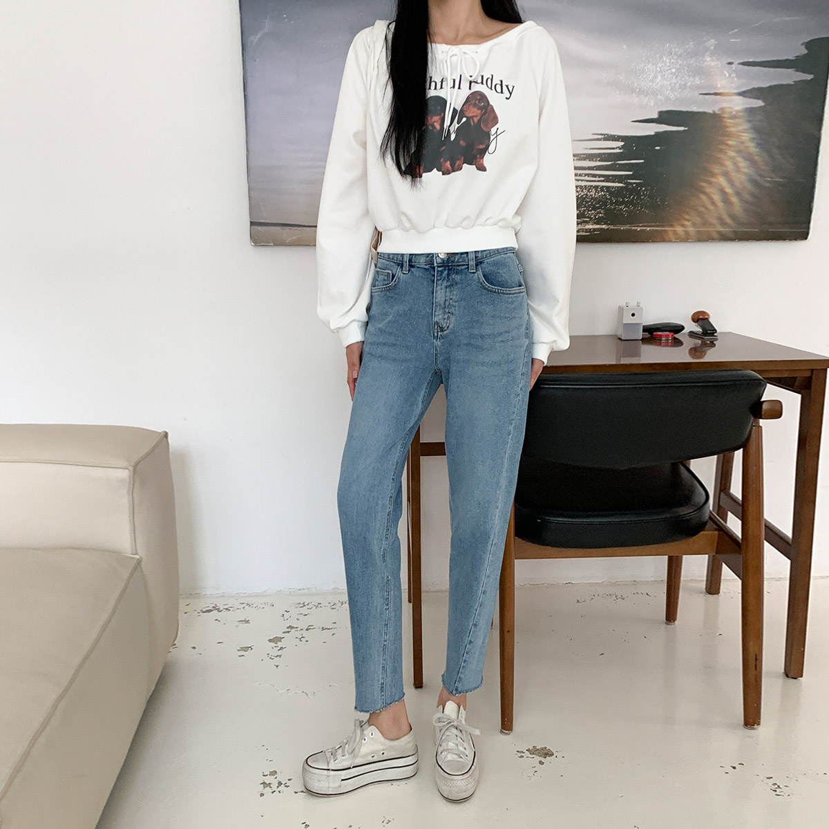 밴딩 9부 레트로 슬림 스트레이트핏 여성 연청 데님 청바지