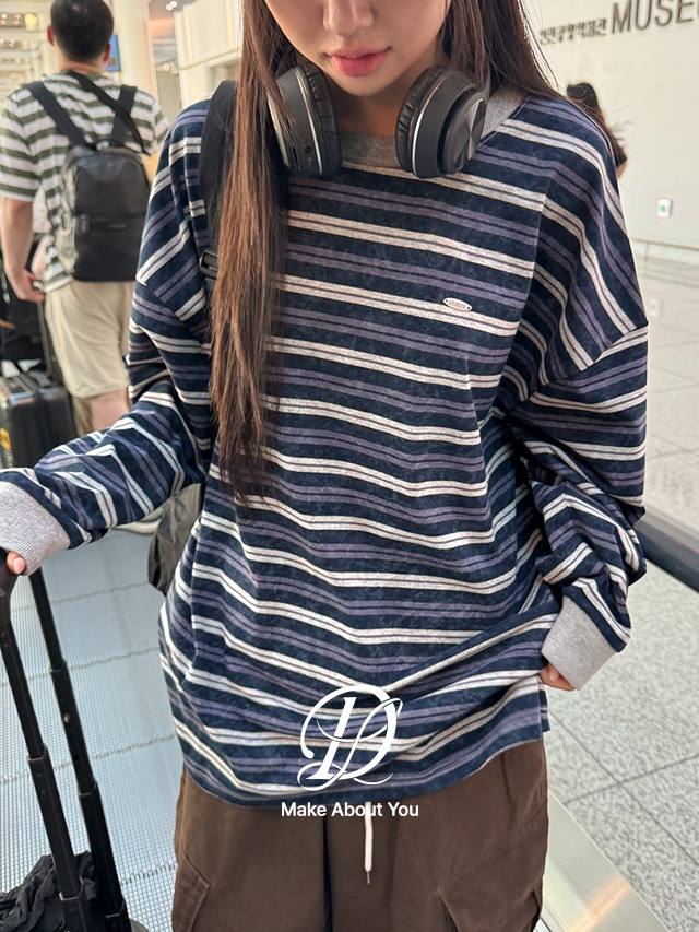 [MADE] 빅사이즈 44-110 세이컨 팬던트 워싱 배색 스트라이프 오버핏 긴팔 티셔츠