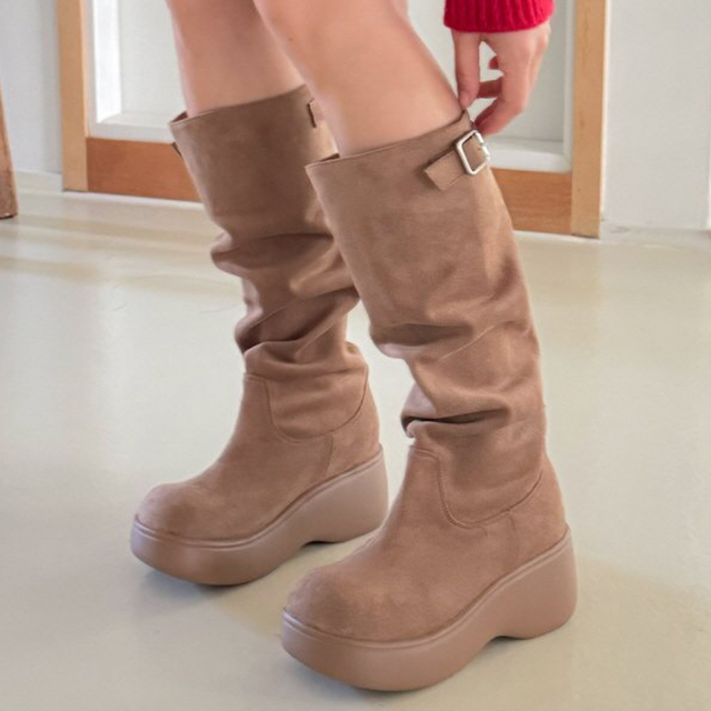 [굽6cm/225~250] 통굽 롱부츠 키높이 가보시 라운드 스웨이드 스트랩 버클 애달-신발