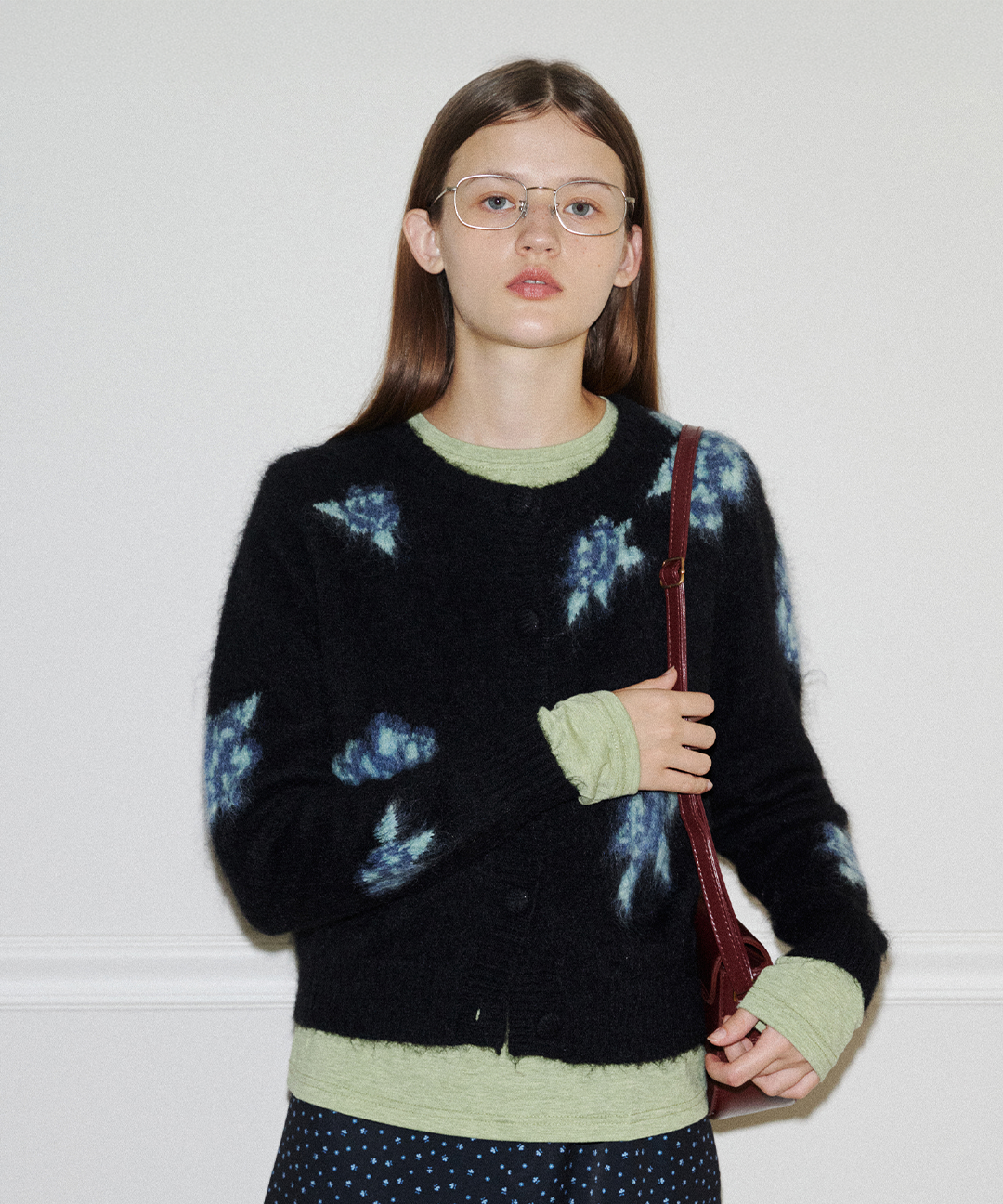 헤어리 플라워 메리노울 니트 가디건 (3C) (Black)