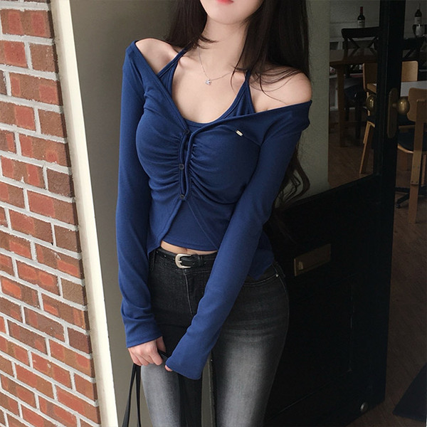 [ 자체제작/ 나시일체형🖤 ] 앤드 홀터넥 셔링 크롭 나시 긴팔 티셔츠