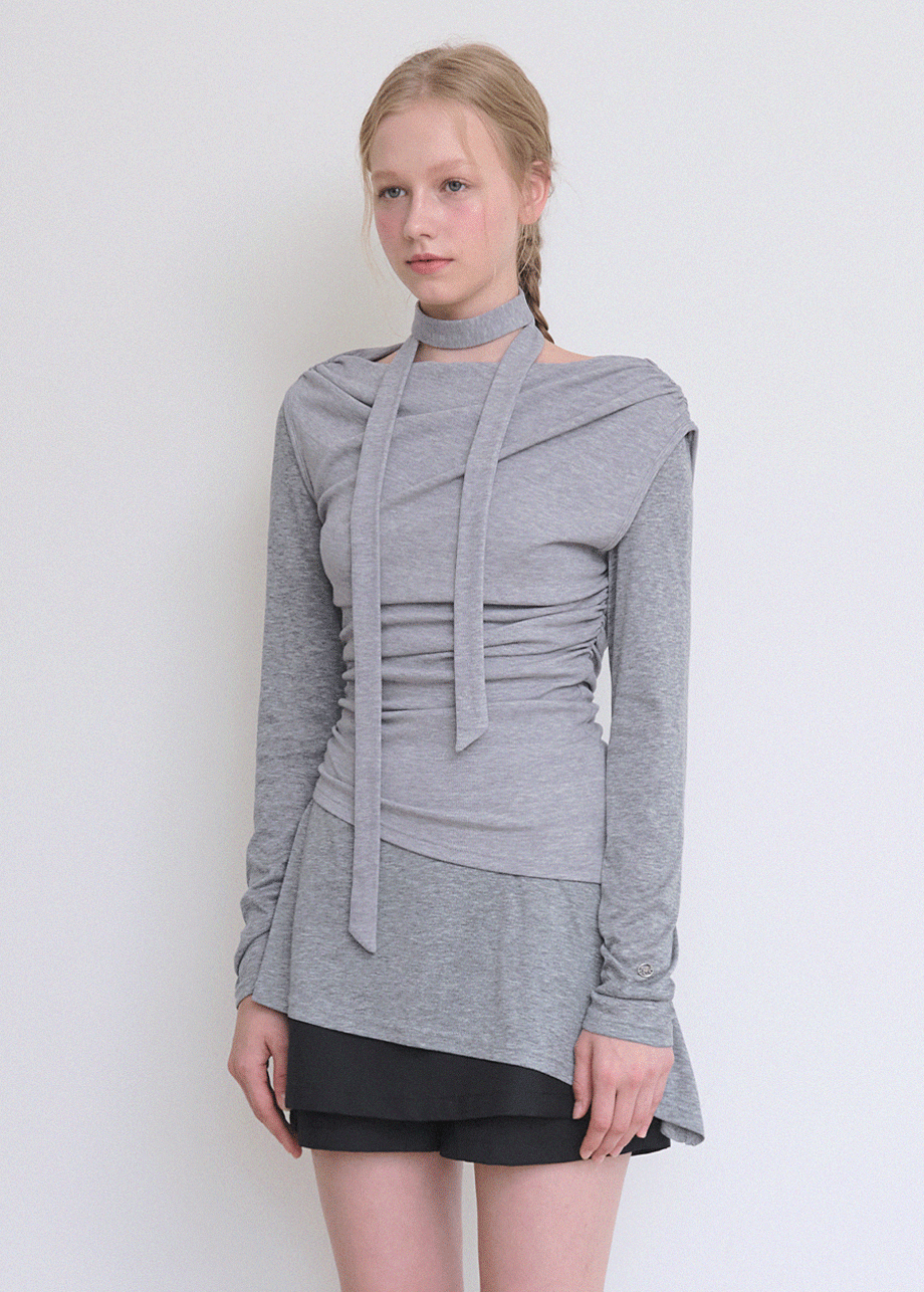 [44-120] Fern Layered Shrring Tee 펀 레이어드 셔링 티 (가을-데일리룩-데이트룩-원숄더-보트넥-언발-밑단-롱슬리브-셔링-타이-페미닌-빅사이즈-자체제작)