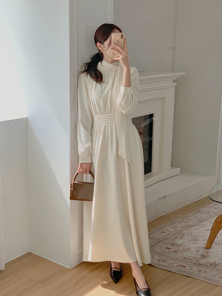 [여신핏하객룩✦/체형보완] [44-120] 마르센디 셔링 핀턱 타이넥 롱 원피스( 가을-신상-가을신상-데일리-데일리룩-데이트-데이트룩-자체제작-하객룩-빅사이즈-120사이즈-통통녀-가을하객룩-여신핏 )