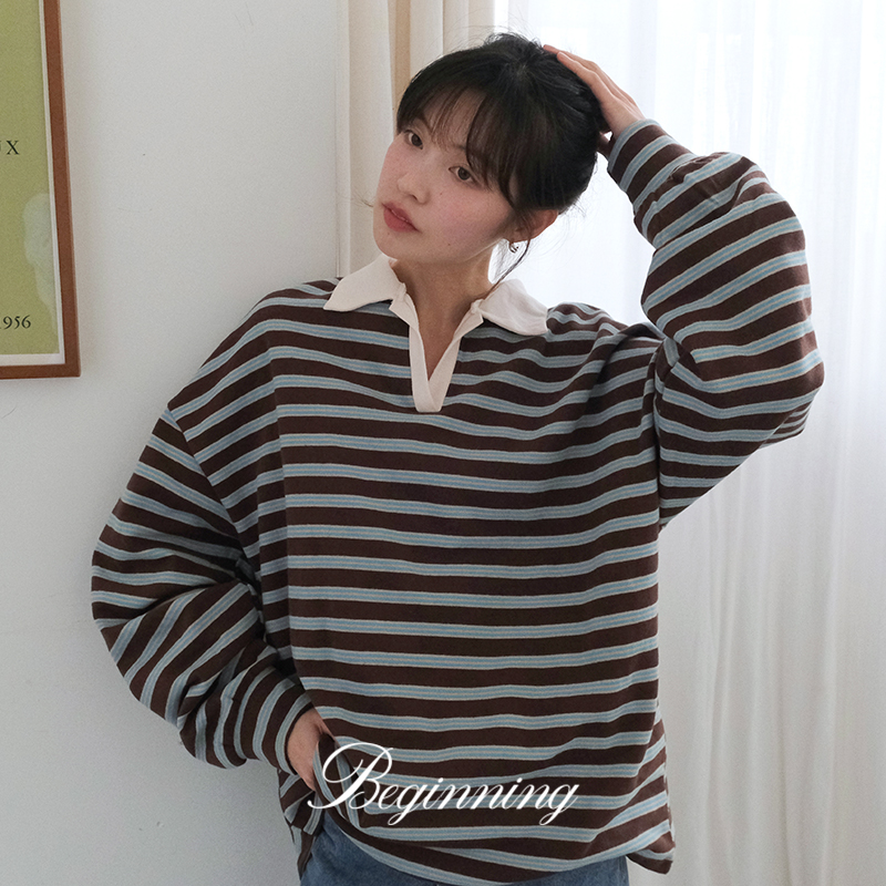 [MADE]기모 스트라이프 카라 맨투맨티 (1color) (맨투맨 기모 스트라이프 상의 티셔츠 레이어드 기모맨투맨 기본티)