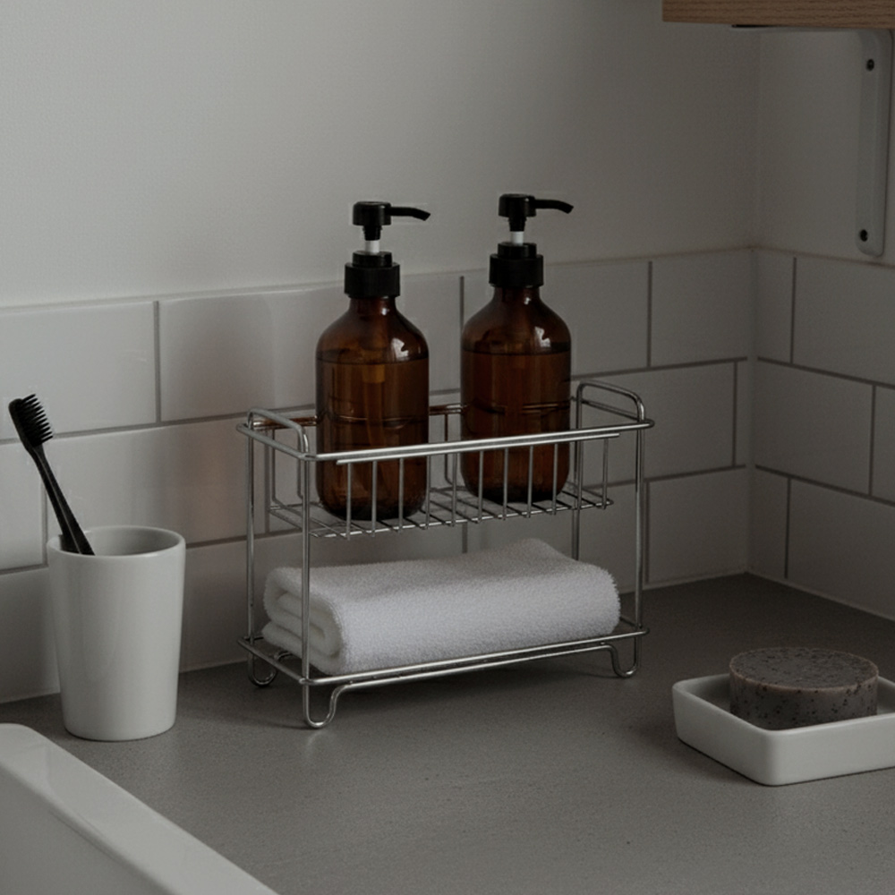 욕실 쇠테리어 스텐 미니 2단 선반 화장실 미니 정리 스테인리스 와이어라인 스탠드 소형