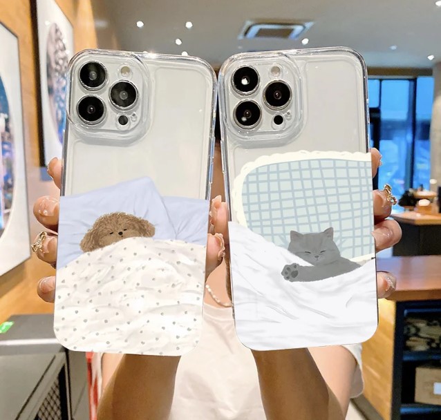 따뜻한 이불 덮은 냥이 댕이 투명 젤리 케이스 카메라보호 아이폰 16프로 갤럭시 S25