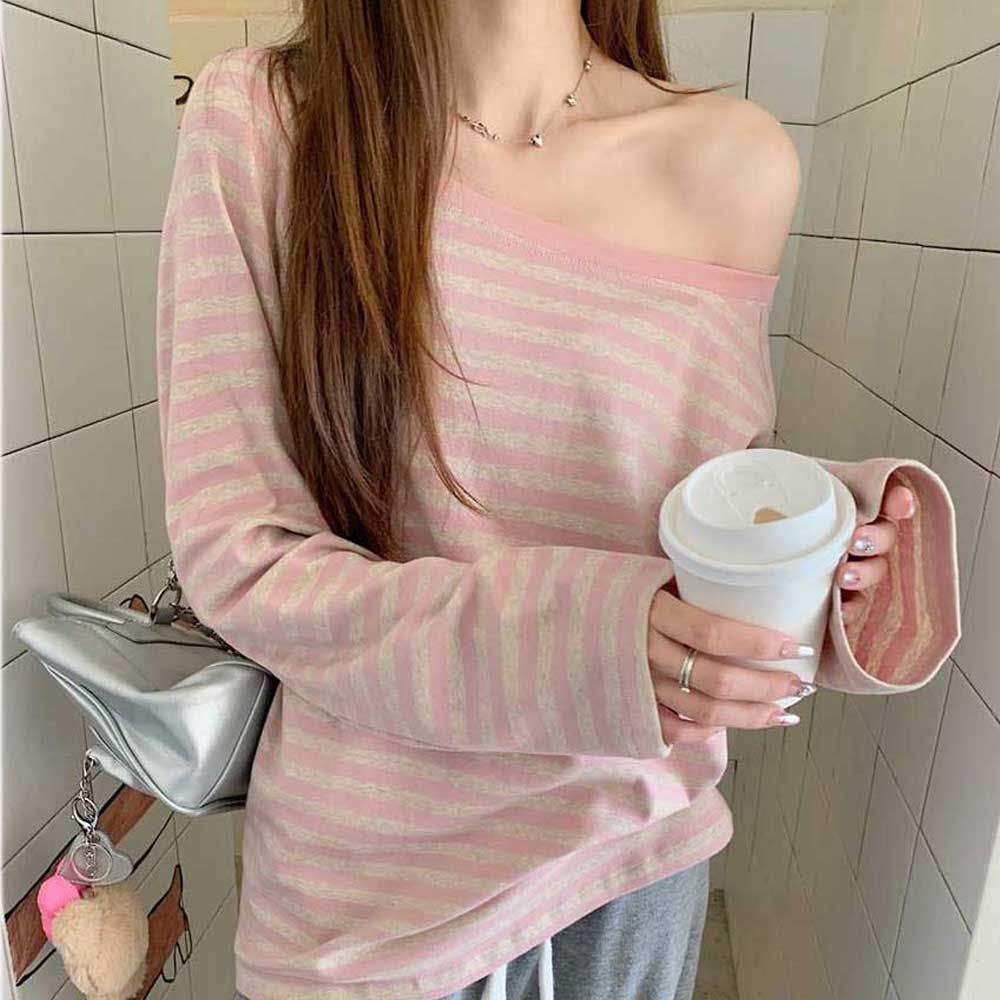 스트라이프 오프 숄더 루즈 핏 긴팔 티 날씬해보이는