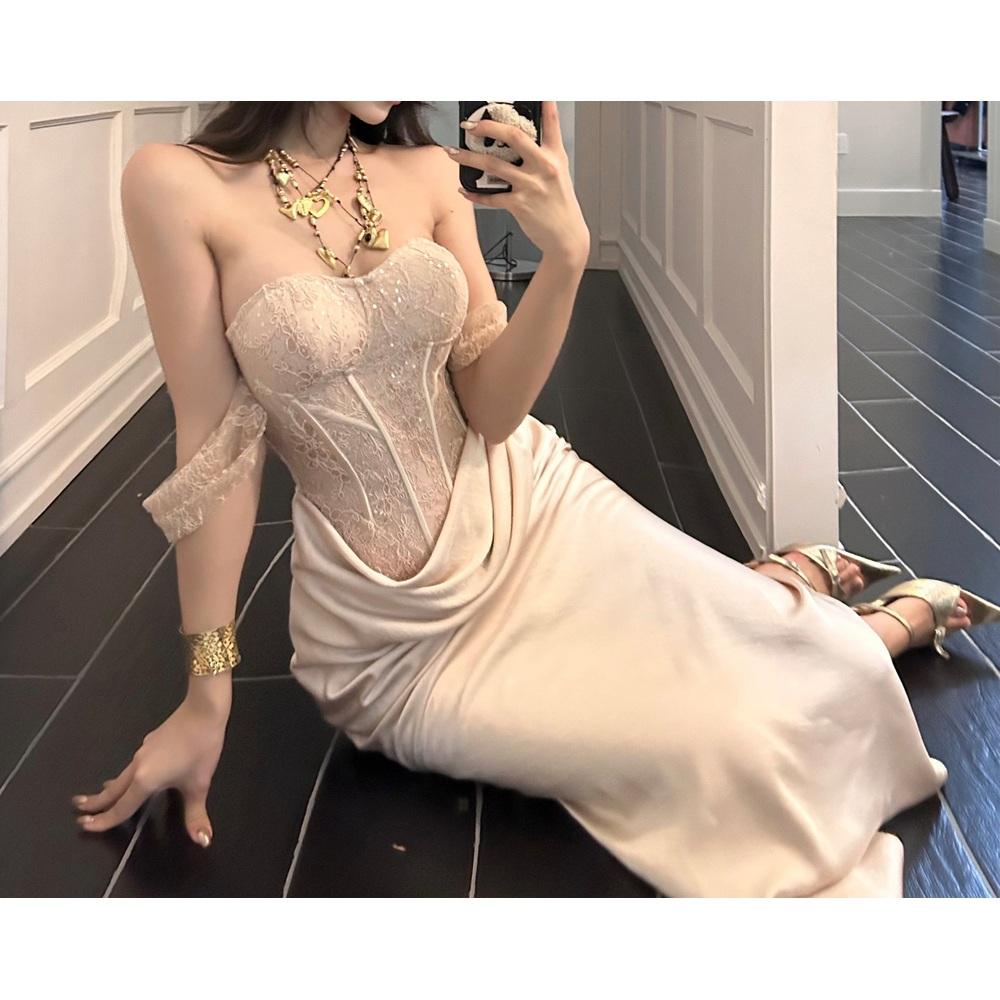 핑크 베이지 오프 숄더 홀터 넥 빈티지 새틴 빈티지 섹시 파티 공연 무대 방송 여신 롱 드레스