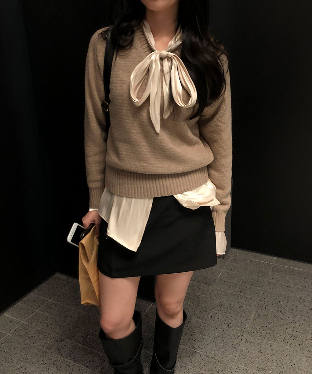 브앳 여성 스카프 타이 봄 이너 레이어드 셔링 링클 루즈핏 오버핏 블라우스