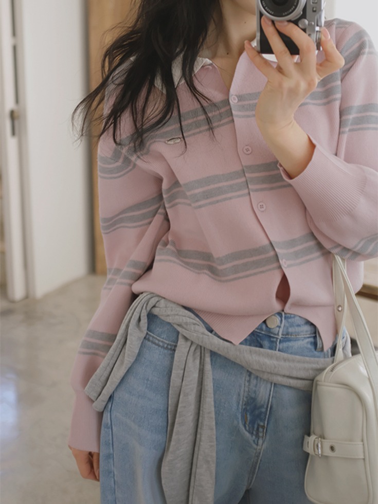 [1천장 돌파✨] [무료배송] [26SS/소프트터치] [44-120] 리베디네 카라넥 배색 스트라이프 펜던트 니트 가디건( 봄-신상-데일리룩-데이트룩-출근룩-캐주얼룩-빅사이즈-120사이즈-긴팔가디건-긴팔니트-스트라이프니트 )