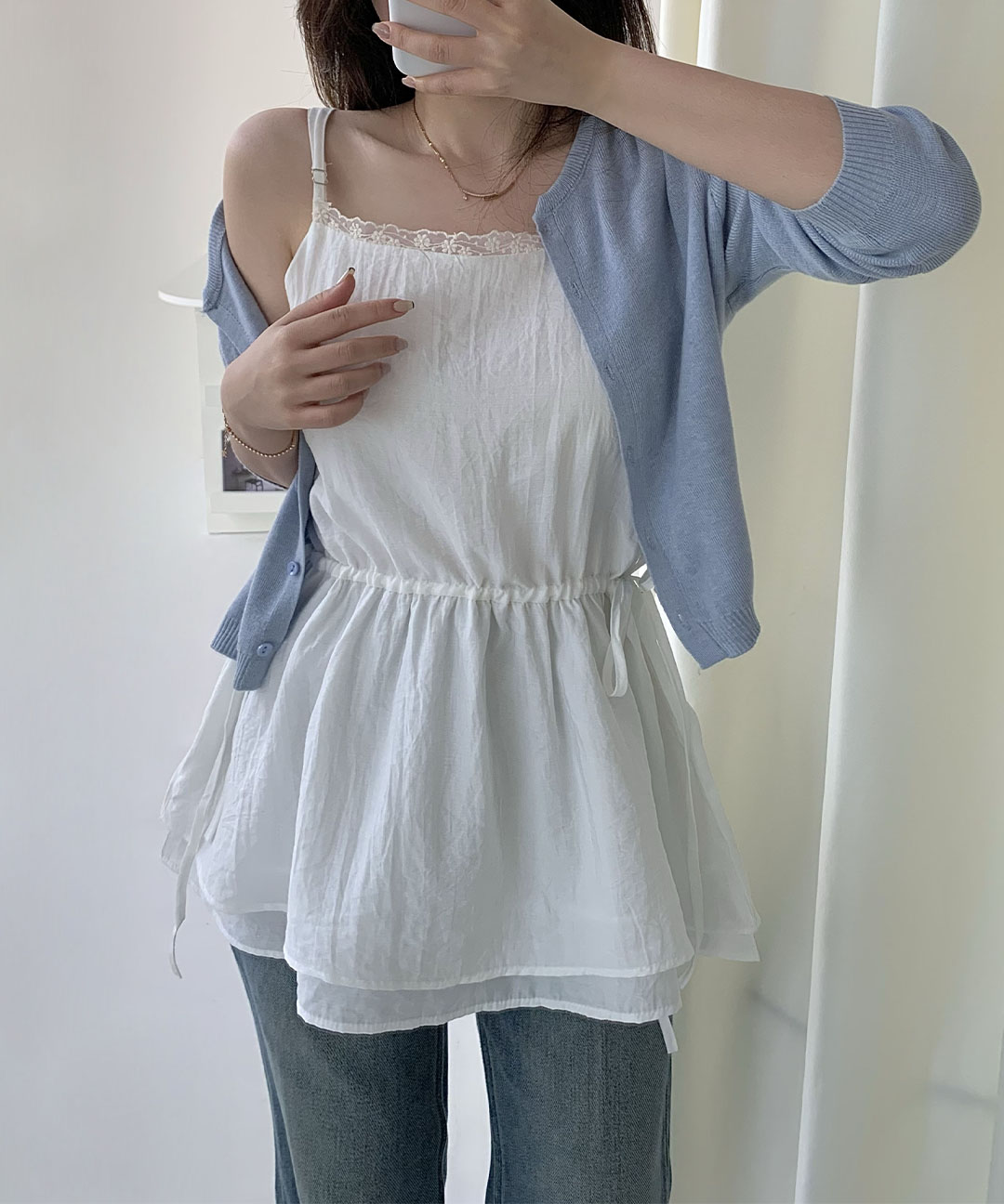 당일출고🚀[주문폭주/신상특가❤️🔥] 나시 뷔스티에 블라우스 원피스 레이어드 미니원피스 슬리브리스 이너 프릴 레이스 허리 스트링 체형커버 여행 데일리 데이트룩 프릴나시