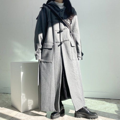 (울50/누빔) 남녀공용 커플 떡볶이 단추 울 누빔 후드 오버핏 더플 겨울 롱 코트 블랙 그레이