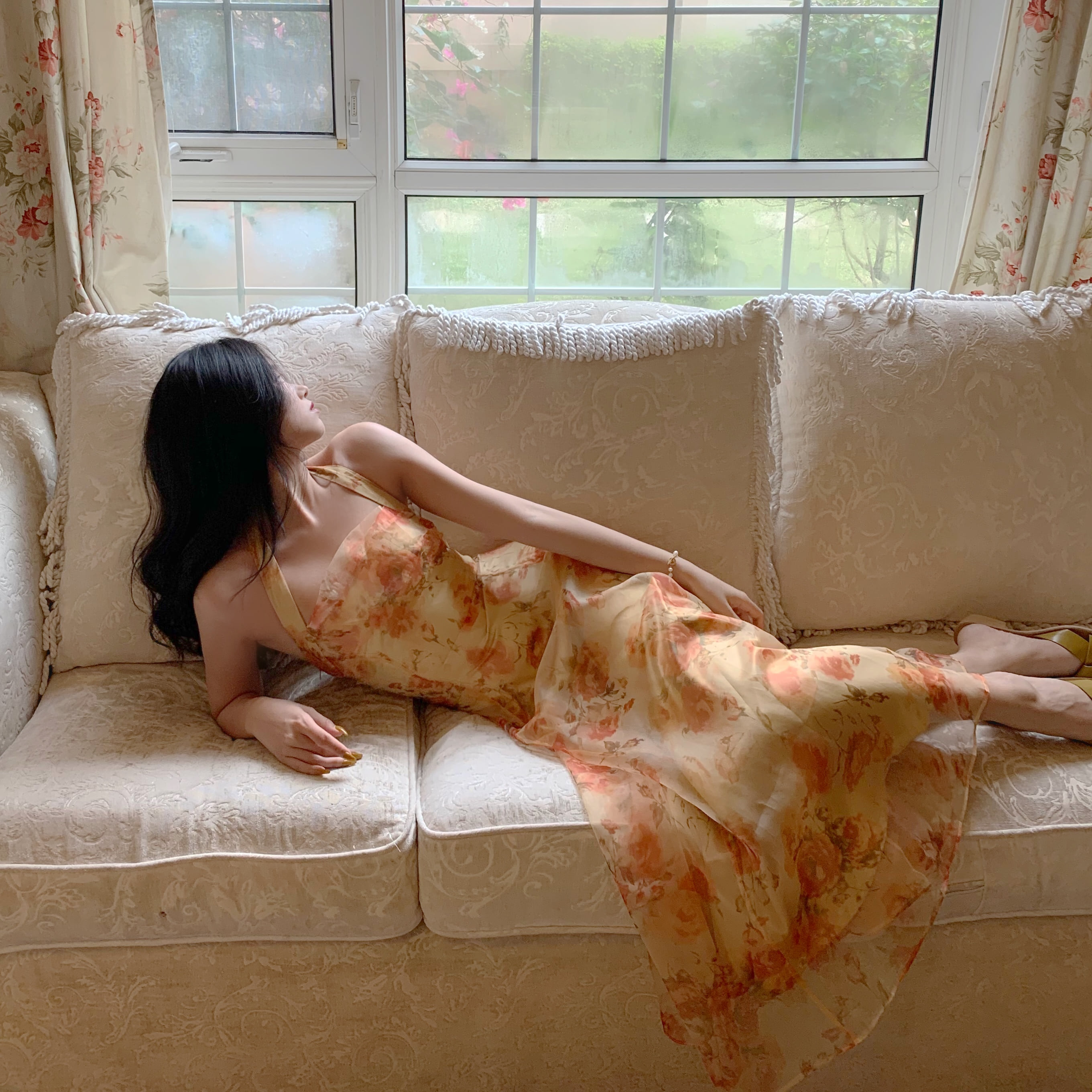 [당일발송] 빈티지 꽃무늬 홀터넥 쉬폰 뷔스티에 끈 오픈 백 롱 원피스 드레스 해변룩/여행룩/휴가룩/촬영룩/캐주얼룩