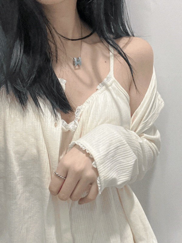 [💌당일/3피스/패드내장] 청순 순면 아이보리 프릴 가디건 나시 팬츠 파자마 잠옷 세트 #117