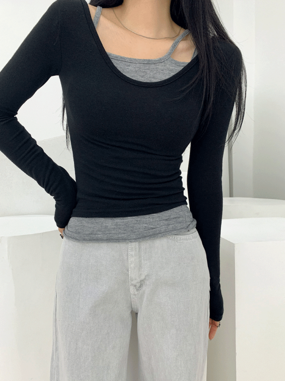 다니아 슬림 쫀쫀 나시 어깨 트임 레이어드 크롭 긴팔 세트