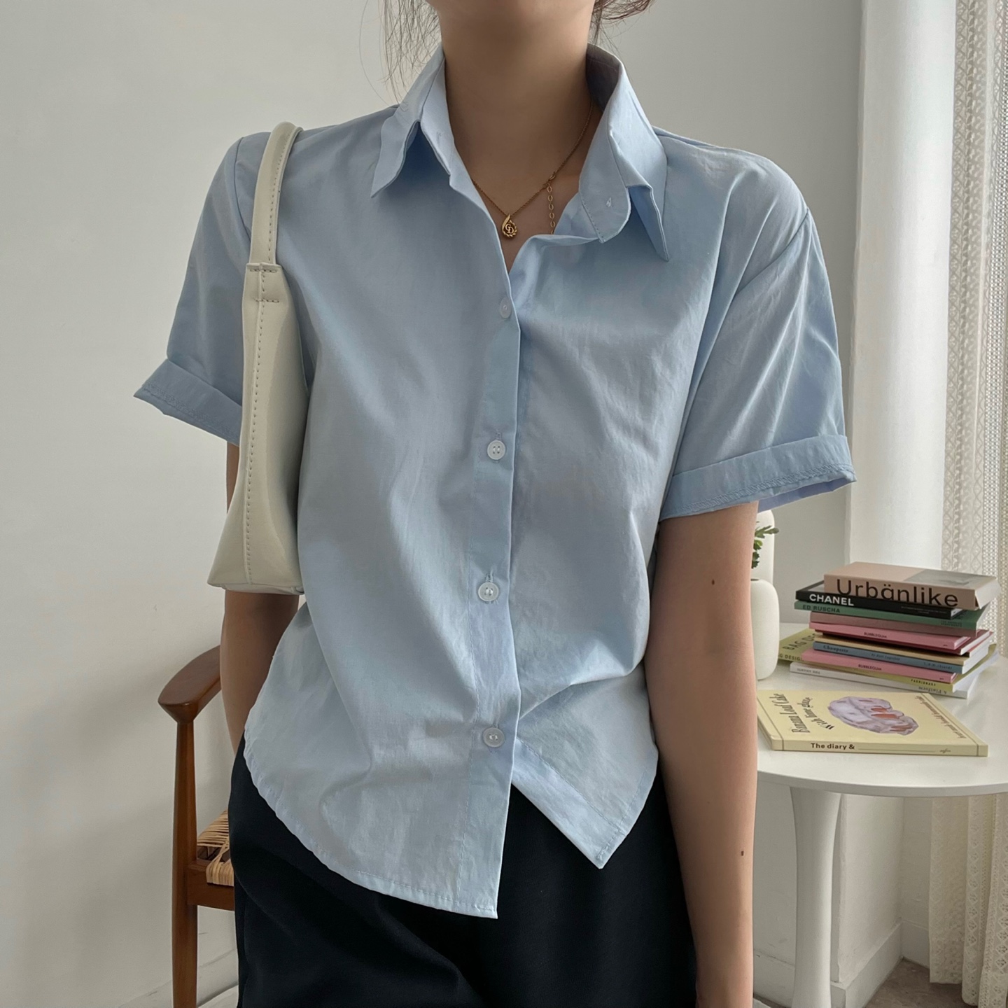 [비침X,베이직] 8컬러 제트 크롭 카라 코튼 반팔 셔츠