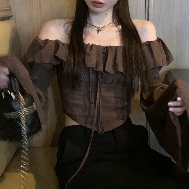 오프숄더 프릴 언밸 크롭 티셔츠 23746